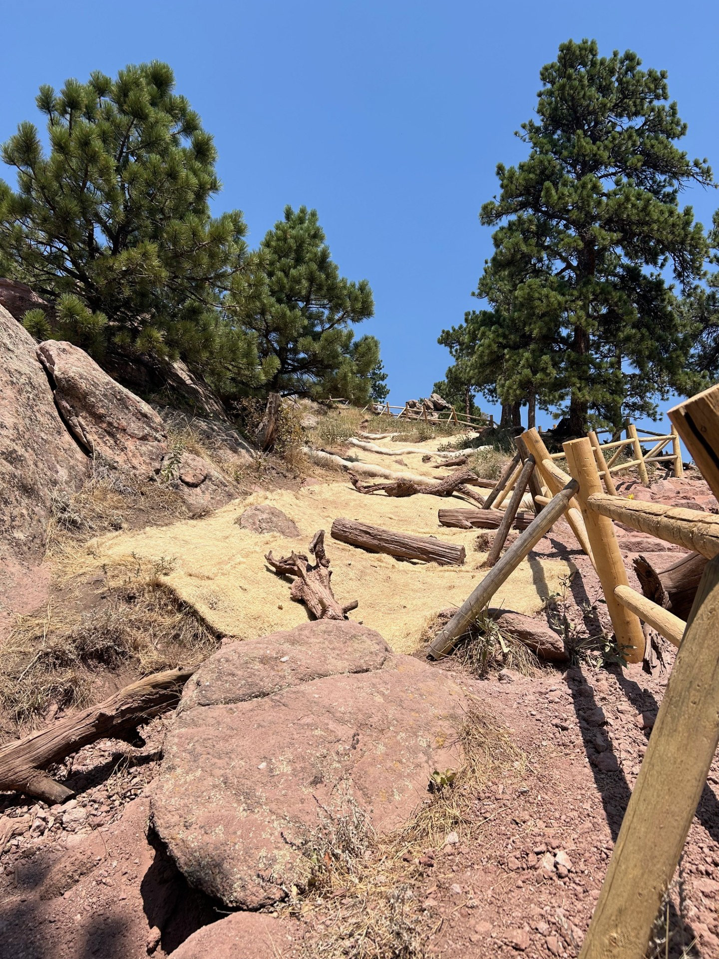 The Mount Sanitas Trail—one of Boulder, Colorado's most popular—sees hundreds of users daily. Ahead of 3–5 years of planned work, this project aimed to make a small, positive improvement and connect with visitors. Over eight weeks, a four-person crew replaced a failing two-foot-wide staircase that had encouraged steep, unsightly social trails and damaged natural resources. We installed 26 steps at a four-foot width, rehabilitating about 60 feet of trail; added approximately 225 linear feet of buck-and-rail fencing to keep people on-trail and define a city-view rest area; and closed roughly 1,000 square feet for restoration with erosion netting and wattles. Extensive bedrock required Hilti drilling before each step was set. Uniquely, pre-quarried stone flown in by helicopter a few years earlier was available; rocks were carried downhill in baskets. Summer heat and minimal shade added difficulty, and a nesting rock wren prompted a minor alignment shift. The crew also partnered with Mile High Youth Corps and the Junior Rangers to move materials to and from the site. The project was completed for the City of Boulder Open Space and Mountain Parks.