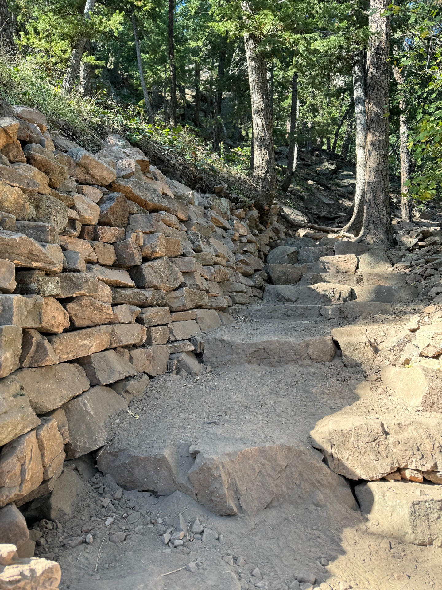 A crew of four constructed a 12-step staircase and a 36-square-foot sidewall. The project took four weeks to complete. The project site necessitated work, as the area had been widened, was severely eroded, and the backslope was not cut to a sufficient angle of repose. The site featured a steep ascent and lacked sufficient structure to address the associated problems. Rock for the project was sourced from a nearby talus field and carried to the site. This section of trail is part of the entrance to one of the most popular trails in the system and therefore required attention due to the high visitor use. The project was completed for the City of Boulder Open Space and Mountain Parks, Colorado.