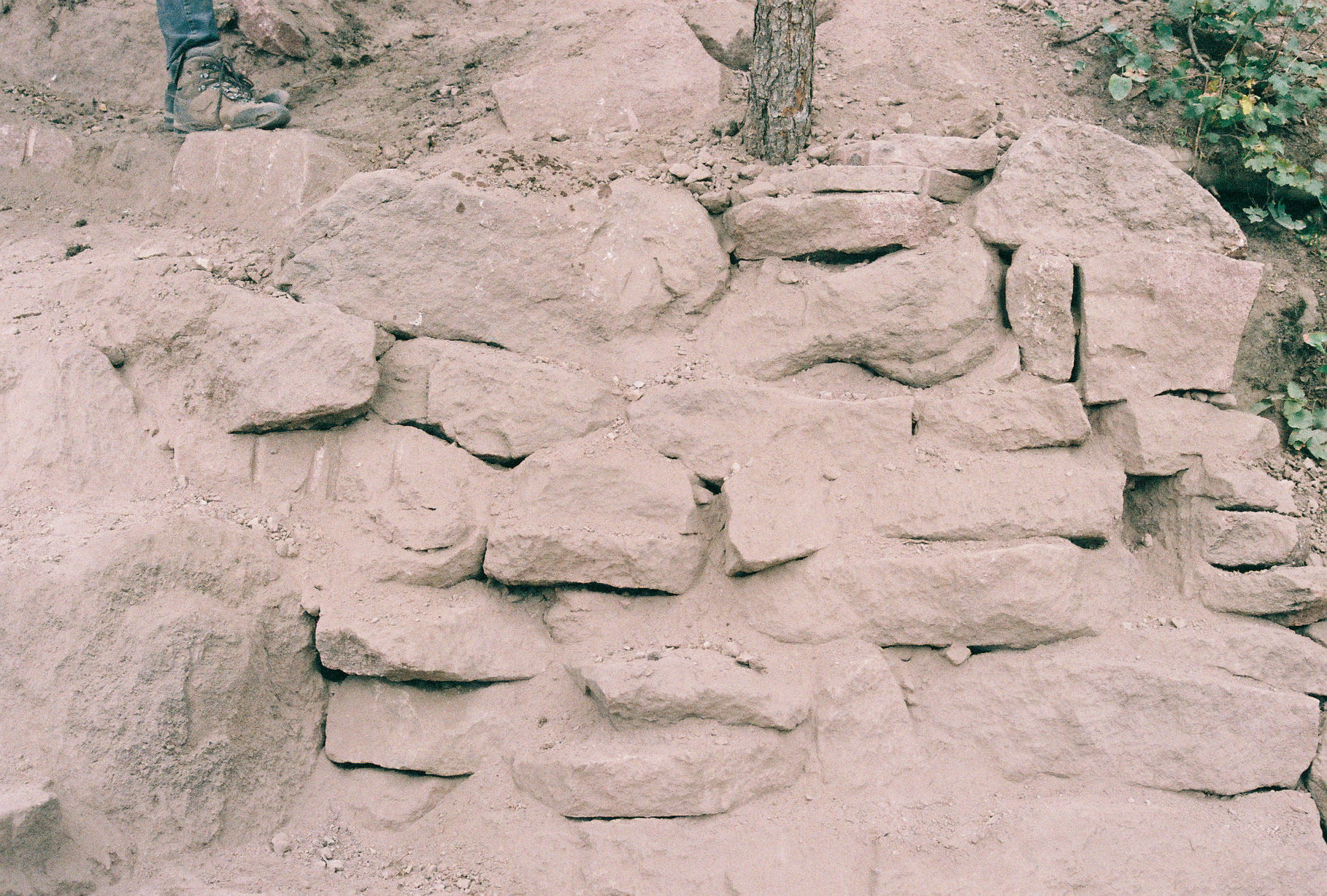 The project involved building 14 steps with a mono-wall to protect a loose critical edge, as well as a stone wall to redefine the turn. The new build creates space for multiple users, redefines the trail, and re-stabilizes an eroded hillside. A crew of three completed the work in 12 weeks using pick mattocks, shovels, McLeods, rock bars, a Griphoist, rock drills, feathers, wedges, chisels, shaping hammers, and expansion bolts. Work was completed for the City of Boulder Open Space and Mountain Parks, Colorado.